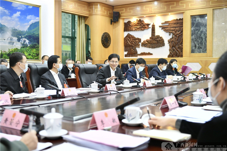 1月17日,自治区主席蓝天立来到自治区十三届人大五次会议崇左市代表团,与代表一起审议政府工作报告。记者 邓华 摄