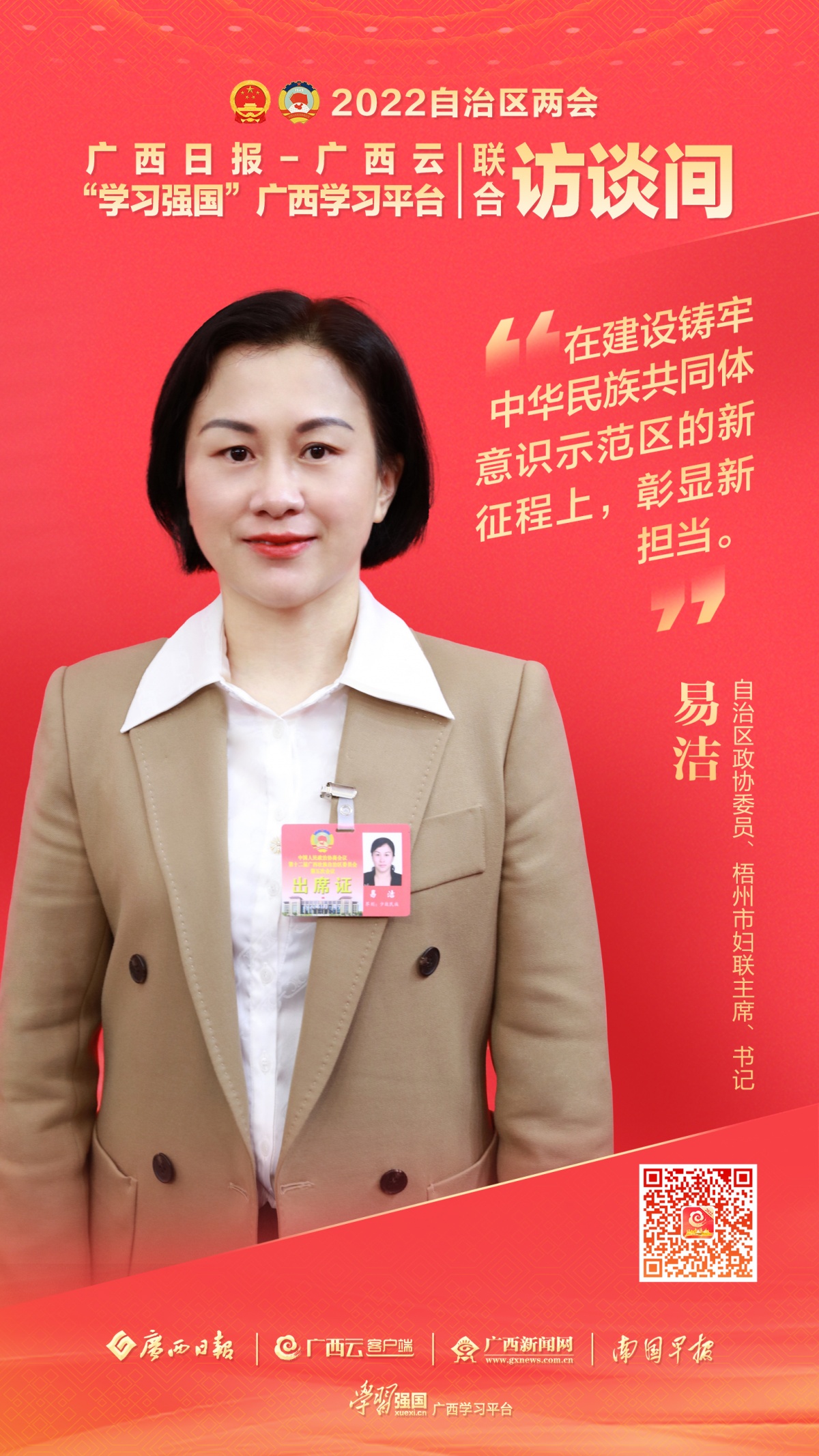 1月18日,自治区政协委员、梧州市妇联主席、书记易洁做客“广西日报-广西云 ‘学习强国’广西学习平台2022自治区两会联合访谈间”,阐述妇女和妇联组织如何在建设铸牢中华民族共同体意识示范区的新征程上彰显新担当,就深化工作品牌、“家家幸福安康工程”等话题接受采访。