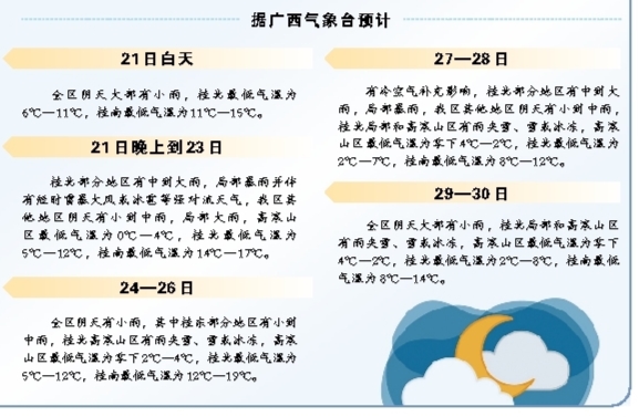 全区阴天有小雨,其中桂东部分地区有小到中雨,桂北高寒山区有雨夹雪、雪或冰冻,高寒山区最低气温为零下2℃—4℃,桂北最低气温为5℃—12℃,桂南最低气温为12℃—19℃。