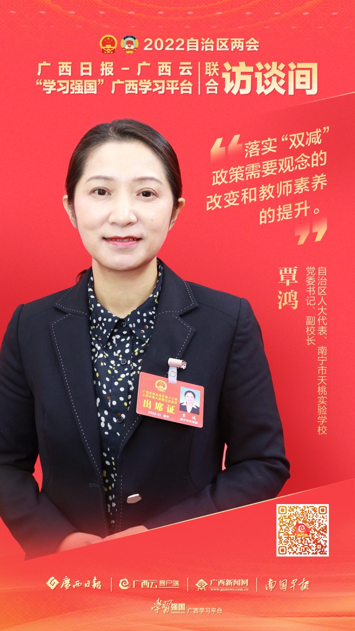 1月20日,自治区人大代表、南宁市天桃实验学校党委书记、副校长覃鸿做客“广西日报-广西云 ‘学习强国’广西学习平台 2022自治区两会联合访谈间”,就“双减”政策等相关话题接受采访。