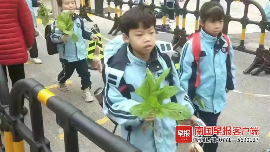 ▲南宁市相思湖学校的孩子拿着青菜和猪肉走出校门。