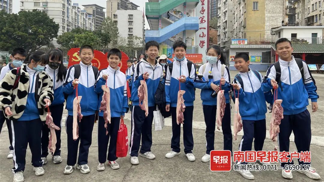 ▲南宁市五里亭第一小学的学生展示收到的猪肉。