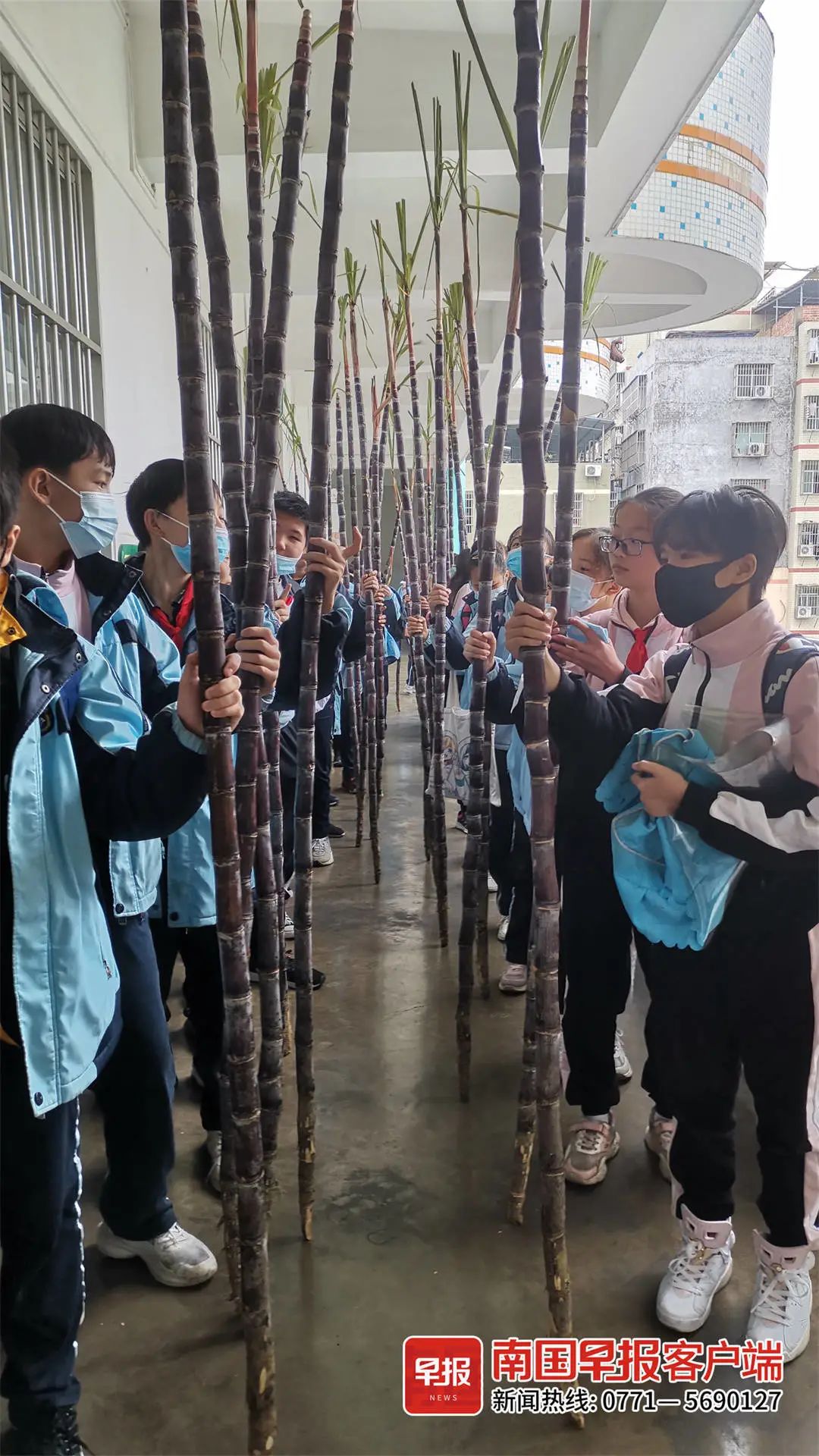 ▲南宁市万秀小学六(3)班的孩子展示自己收到的甘蔗。