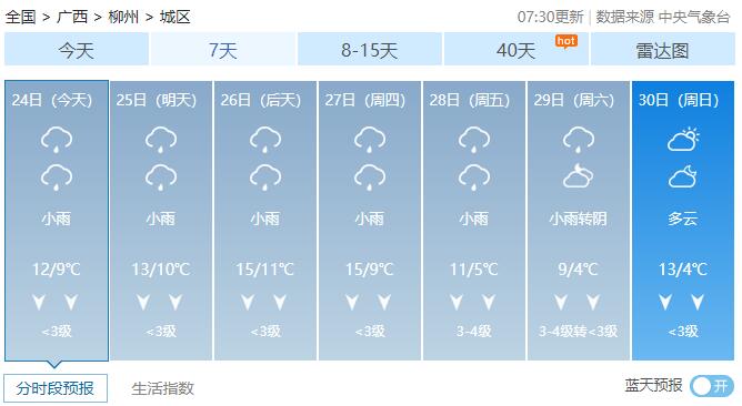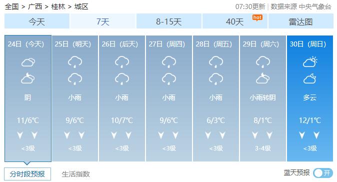 24日白天,全区阴天有小雨,其中桂林、柳州两市局部有中雨到大雨,其中高寒山区局部有雨夹雪或冰冻。各地最低气温:高寒山区零下1~4℃,桂北5~12℃,桂南12~17℃。