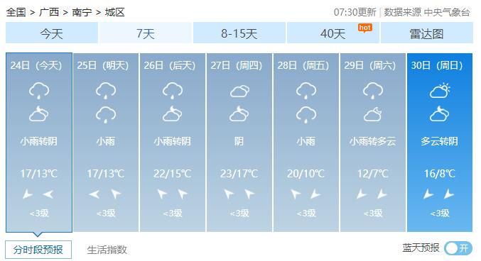 南宁市:24日白天阴天,北转东北风2级,最低气温13℃,最高气温17℃。