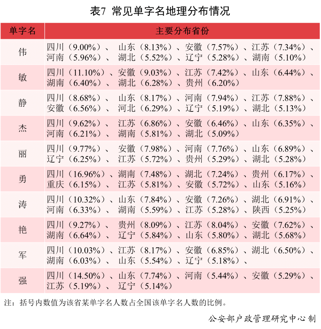 全国使用最多的10个单字名相对集中分布在四川、山东、安徽、河南、江苏、湖北、湖南、辽宁等省份。此外,还有6.20%的“敏”、5.29%的“丽”、6.17%的“勇”、8.09%的“艳”分布在贵州;6.29%的“静”分布在河北;6.15%的“勇”分布在重庆;5.25%的“涛”分布在陕西。
