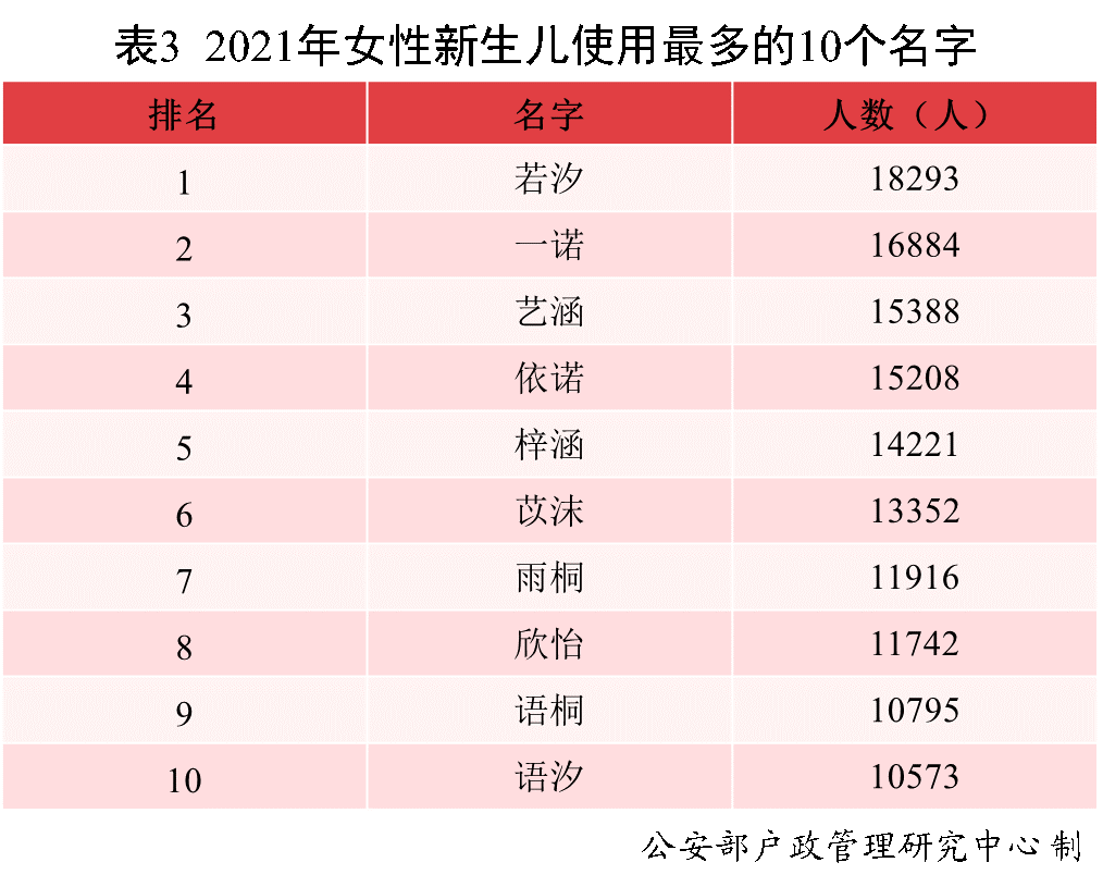 2021年出生并已经进行户籍登记的女性新生儿中,使用频率最高的10个名字依次为:若汐、一诺、艺涵、依诺、梓涵、苡沫、雨桐、欣怡、语桐、语汐。与2020年相比,若汐、艺涵、苡沫首次进入前十,其中“若汐”使用人数达到1.8万,登顶榜首,成为女性新生儿名字首选。