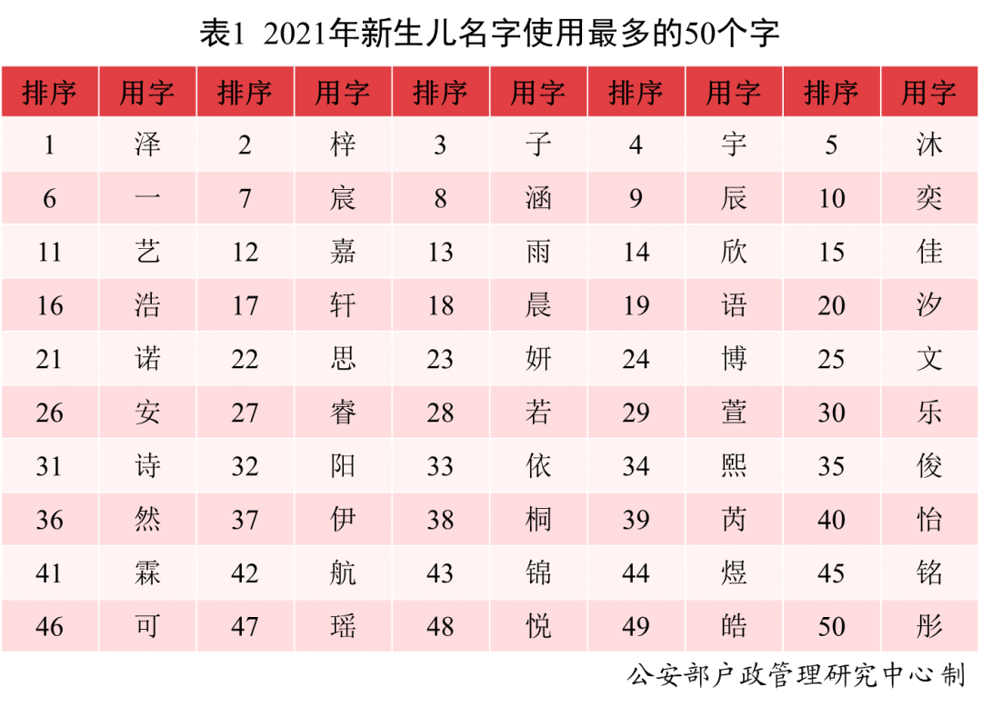 2021年出生并已经进行户籍登记的新生儿名字中,使用频率最高的50个字依次为泽、梓、子、宇、沐等。与2020年相比,汐、芮、霖、航等字受到青睐。