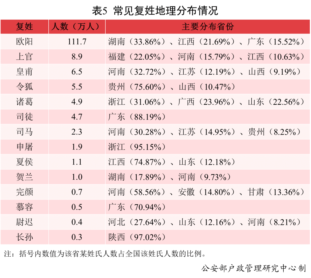 常见复姓“聚居”的特点非常突出,复姓人口在个别省份的分布较为集中。如,复姓“欧阳”33.86%的人口分布在湖南;复姓“上官”22.05%的人口分布在福建;复姓“皇甫”32.72%的人口分布在河南;复姓“令狐”75.60%的人口分布在贵州;复姓“诸葛”31.06%的人口分布在浙江;复姓“司徒”88.19%的人口分布在广东;复姓“司马”30.28%的人口分布在河南;复姓“申屠”95.15%的人口分布在浙江;复姓“夏侯”74.87%的人口分布在江西;复姓“贺兰”17.89%的人口分布在湖南;复姓“完颜”58.56%的人口分布在河南;复姓“慕容”70.94%的人口分布在广东;复姓“尉迟”27.64%的人口分布在河北;复姓“长孙”97.02%的人口分布在陕西。