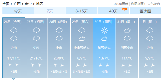 南宁市:今天白天到今天晚上,阴天有小雨,有雾,东南风1~2级,最高气温17℃,最低气温11℃。