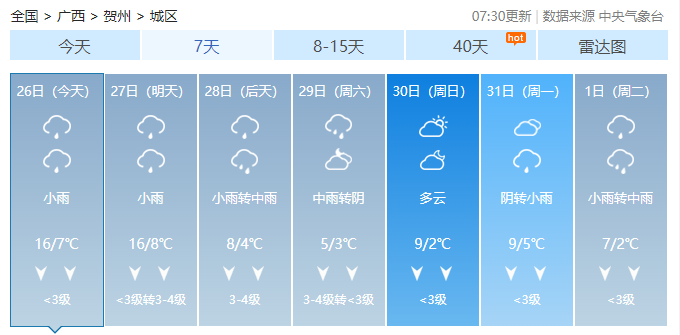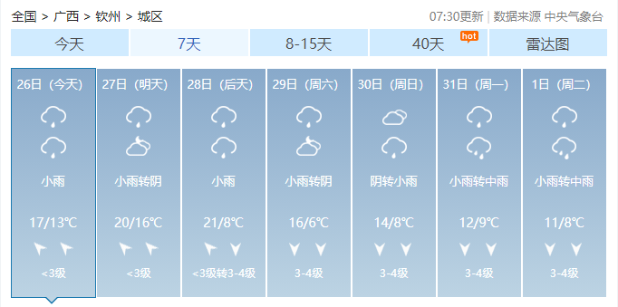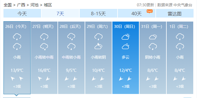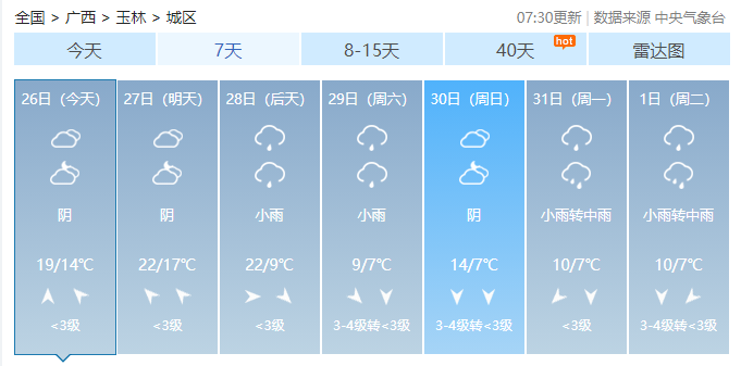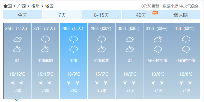 今天白天到27日白天,全区阴天大部有小雨,其中桂林、柳州两市局部有中到大雨,桂南部分地区有雾和轻度回南天气。各地最低气温:高寒山区0~4℃,桂北5~12℃,桂南12~18℃。