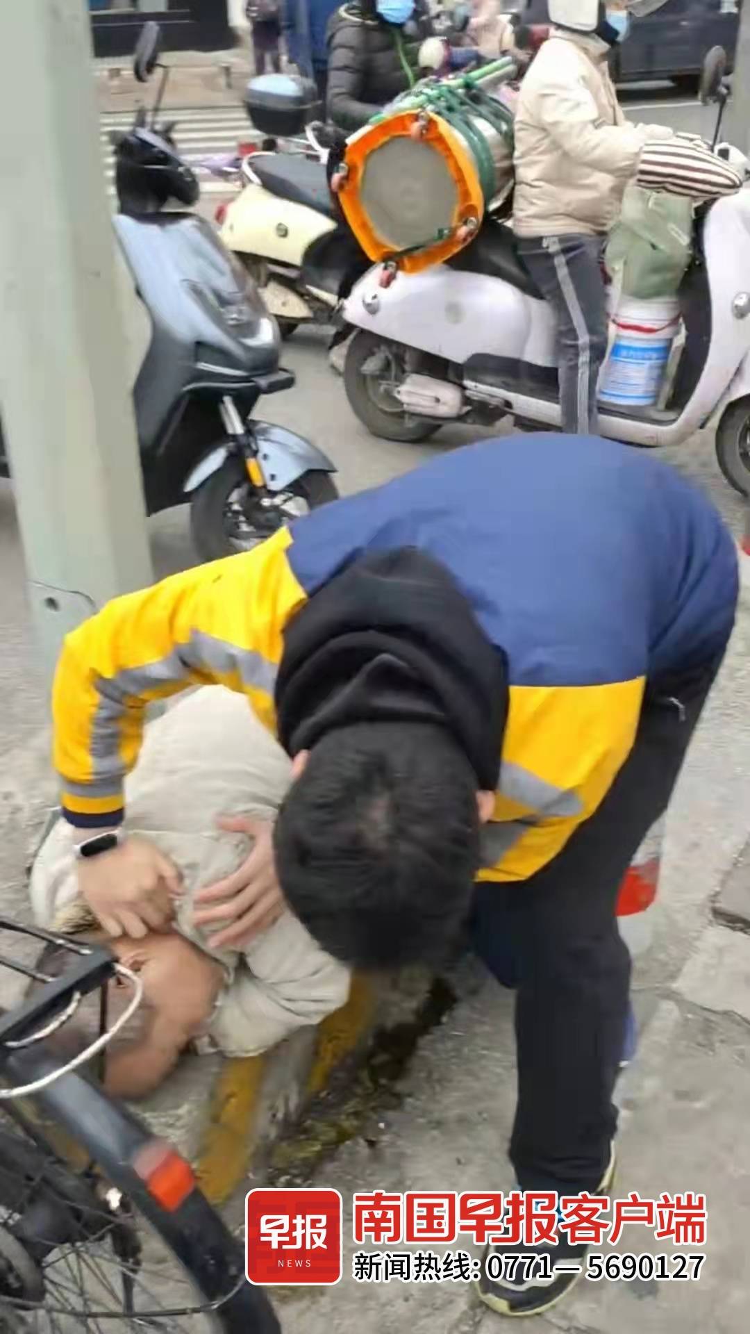 当日15时50分,张耀经过民主园湖路口的交通安全岛时,看到一位老人呈坐卧位趴在路口的水泥墩上,拳头紧握,表情痛苦。张耀是南宁一中“微光”志愿者团成员,2021年曾参加全国中学生志愿服务训练营,拥有红十字救护员证。