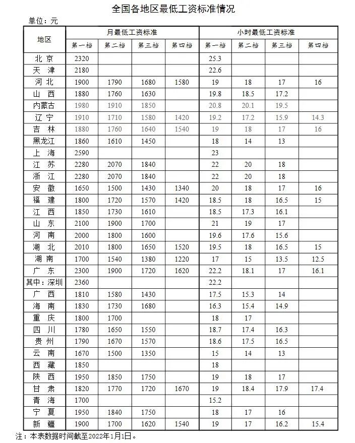 全国各地区最低工资标准情况(截至2022年1月1日)。来自人社部网站