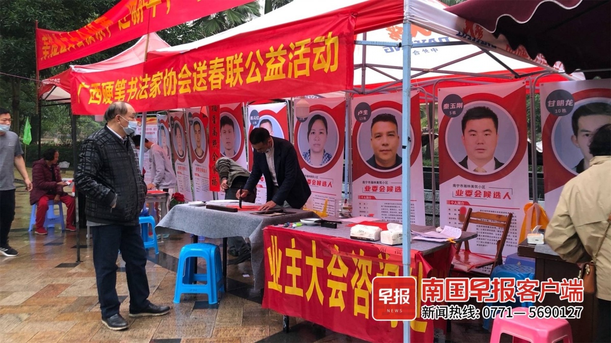 “欢迎使用电子投票线上选举咱们小区的业委会成员。”1月23日,志愿者李建勇在南宁市瀚林美筑小区志愿服务点向业主进行宣传。该服务点立有多块参与业委会成员竞选的候选人简介牌。