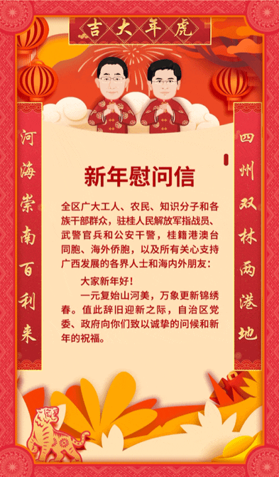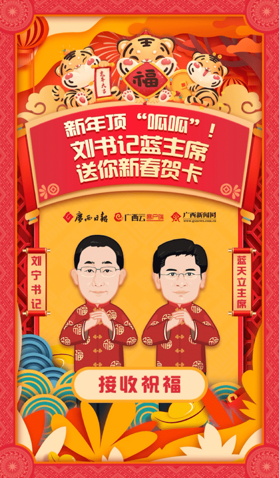 伴随着欢乐喜庆的音乐,自治区党委书记、自治区人大常委会主任刘宁和自治区党委副书记、自治区主席蓝天立以身着唐装的动漫形象,向全区人民拜年。点击“接收祝福”按钮,即可接收自治区党委、政府发出的新年慰问信。