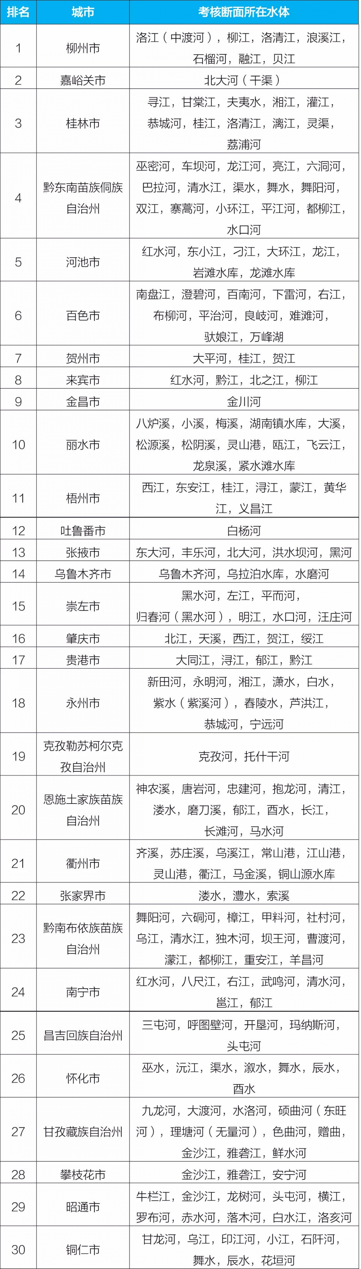2021年1-12月国家地表水考核断面水环境质量状况表显示,广西上榜前30位的10个城市具体排名为:柳州市(第1名)、桂林市(第3名)、河池市(第5名)、百色市(第6名)、贺州市(第7名)、来宾市(第8名)、梧州市(第11名)、崇左市(第15名)、贵港市(第17名)、南宁市(第24名)。排名后30名的城市中无广西城市。