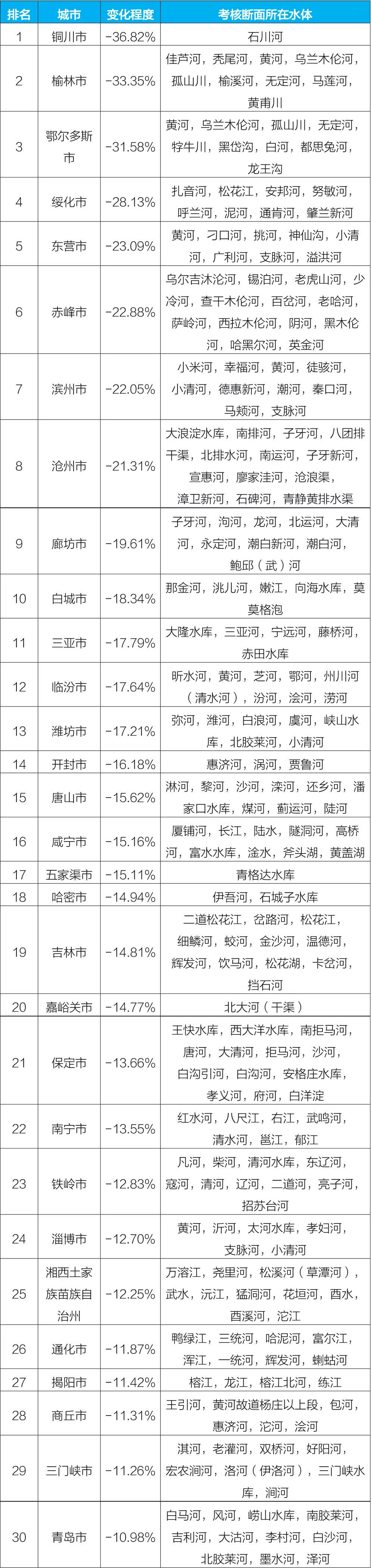 2021年1-12月国家地表水考核断面水环境质量变化情况排名前30位城市及所在水体