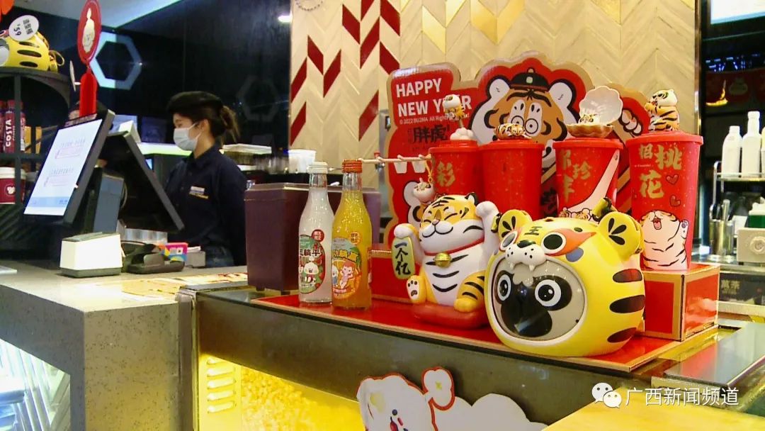 万达影城南宁区域营运经理 彭欢:来自贵州丹寨的天然高山云雾茶,还有富含锌硒元素、原生态的一个米,“胖虎”主题的一些衍生品,像我们的玩偶啊,盲盒呀,毛绒玩具啊,是非常符合春节的这样一个氛围在里面的。