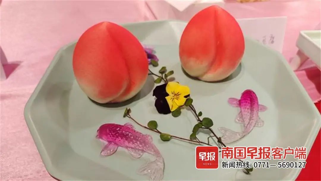 在新年茶点方面,南宁肥仔推陈出新。南宁肥仔董事长滕锡鹏介绍,他们在春节前举行了厨艺大赛,点心师傅创作了新点心,有“寿桃年年有余”、芒果玉米慕斯、灌汤白烧卖等。