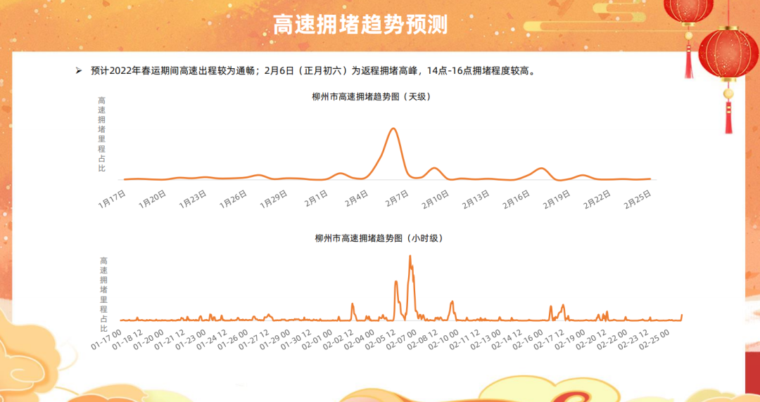 春节长假最后两天(2月5日-6日)为返程高峰,15点-18点拥堵程度较高,高速公路、国省道、县乡道路中短途交通流量将显著增加。