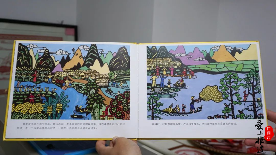钟昀睿以民族剪纸方法创作设计的世界文化遗产花山岩画传说系列绘本故事之一《灯笼山》。甘艳霞 摄
