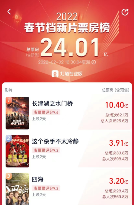据灯塔专业版统计,截至2月2日16时30分,2022年春节档总票房(含预售)突破24亿,大年初一票房达到14.41亿。