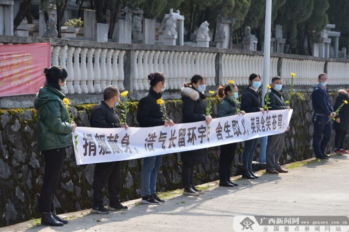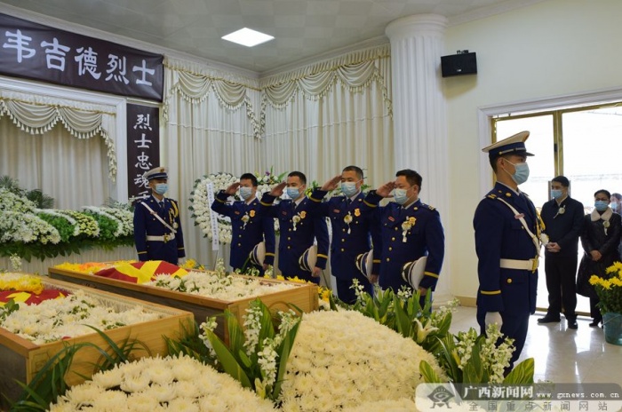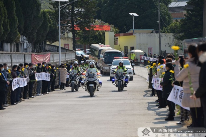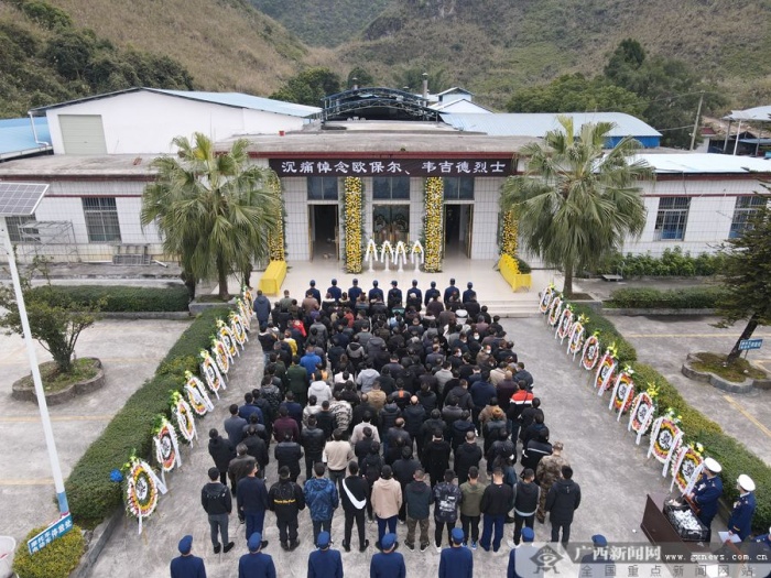 广西新闻网河池2月3日讯(通讯员 黄文华)杨柳伤怀,草木含悲。2月3日,欧保尔、韦吉德烈士告别仪式在河池市殡仪馆举行。欧保尔、韦吉德烈士的家属、生前战友和好友,以及自发前往的社会各界群众代表怀着无比悲痛的心情,送英雄最后一程。