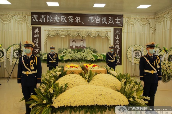 悼念大厅内,庄严肃穆,哀乐低回,挽幛轻垂。仪式上宣读了应急管理部、广西壮族自治区人民政府分别批准欧保尔、韦吉德两位同志为烈士,应急管理部消防救援局为两位同志追记一等功,共青团广西区委追授两位同志“广西青年五四奖章”等文件;介绍了欧保尔、韦吉德烈士的生平事迹,回顾了他们为应急管理及消防救援事业不懈奋斗、为党和人民利益鞠躬尽瘁的一生。
