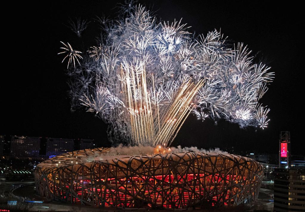 2月4日晚,第二十四届冬季奥林匹克运动会开幕式在北京国家体育场举行。图为焰火表演。新华社记者 邬惠我 摄