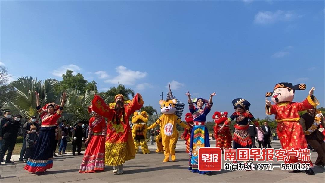 4日上午,阳光灿烂,不少市民全家出动,前往南宁园博园游玩。在园博大道,当天举行了快闪巡游,呆萌“金虎”、Q版财神爷以及舞狮等表演队伍,伴着欢乐喜庆的音乐边走边舞,还不时与游客互动,给大家送上新春礼物。据了解,2月1日至6日,南宁园博园内每天的11:30-12:00和13:30-14:00都会举行“金虎”巡游。此外,身着我国各族传统服装的游客可享受门票优惠。