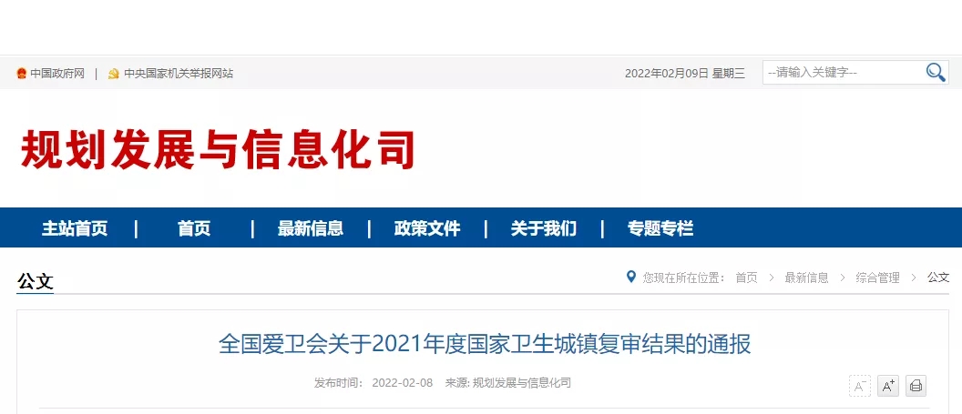 2021年度国家卫生城镇复审结果的通报