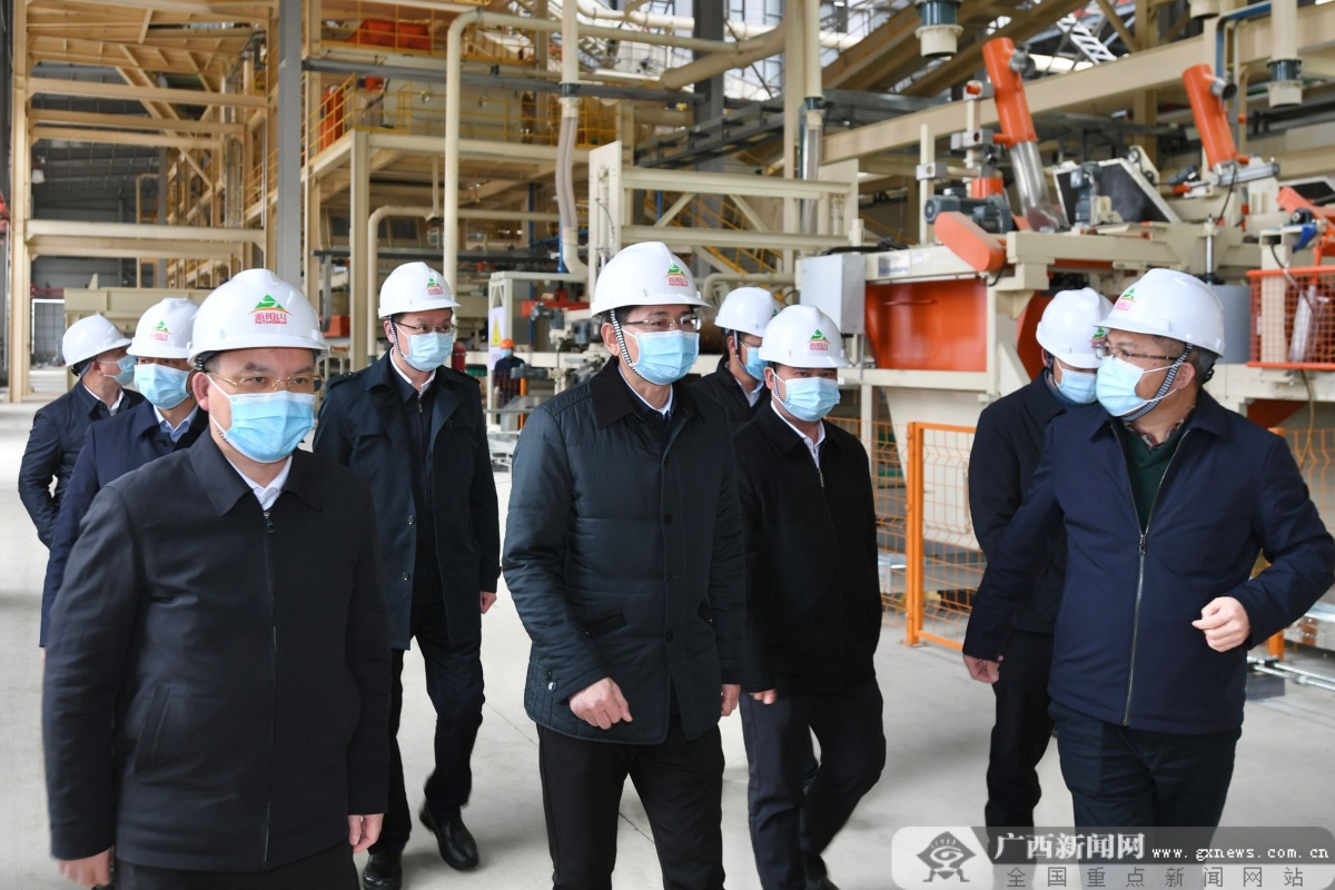 在广西祥盛家居高端制造项目,蓝天立详细察看年产30万立方米超强刨花板项目建设进度,认真听取宁明县林业产业发展情况介绍。广西日报-广西云客户端记者 邓华 摄
