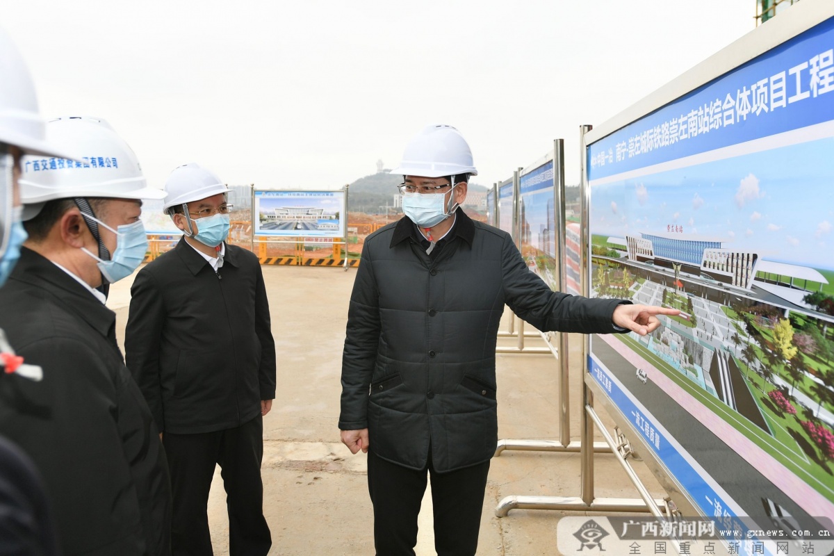 南宁—崇左城际铁路是自治区全额投资建设的第一条高速铁路。南崇高铁崇左南站目前已经完成房屋面工程,有望在4月达到静态验收条件。蓝天立来到项目工地,实地考察项目建设进展,亲切慰问一线工作人员,希望大家继续铆足干劲,科学组织施工。他强调,南崇高铁是西部陆海新通道的重要交通基础设施,要在做好常态化疫情防控的前提下,加快施工进度,确保项目尽早建成、发挥效益。要统筹做好火车站片区规划建设,确保建筑造型和功能布局统一协调、科学实用,充分发挥高铁的综合带动效应。