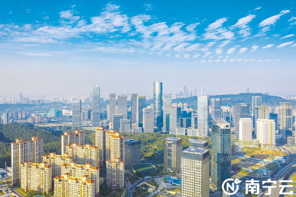 2021年全市经济持续恢复发展,生产需求全面回暖,质量效益稳步提升。图为五象新区金融城焕发勃勃生机,吸引众多大企业入驻。