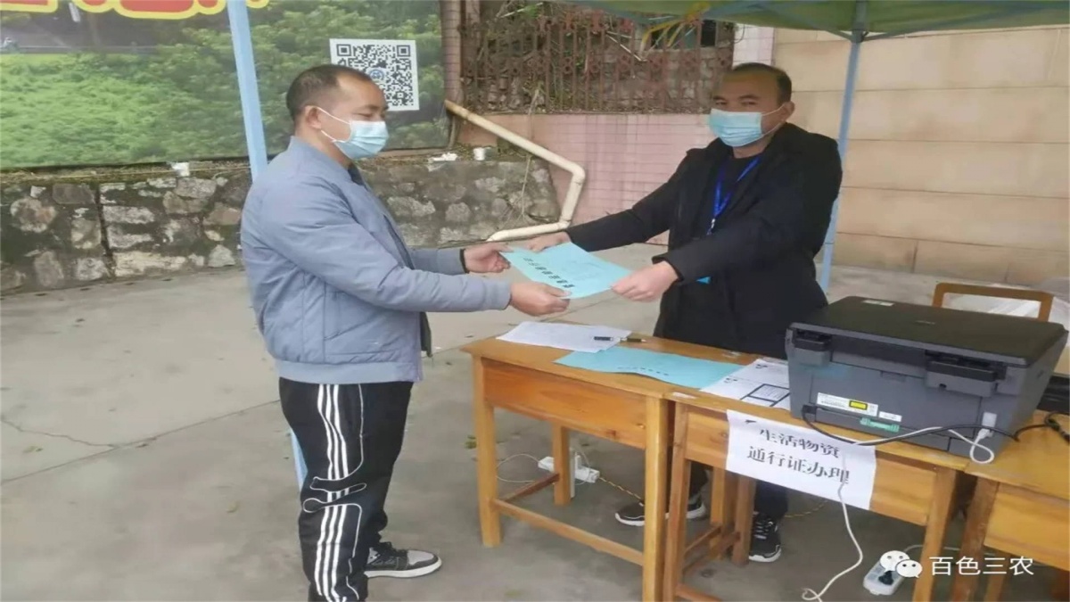 工作人员给司机发放生活必需品车辆通行证。百色市农业农村局供图