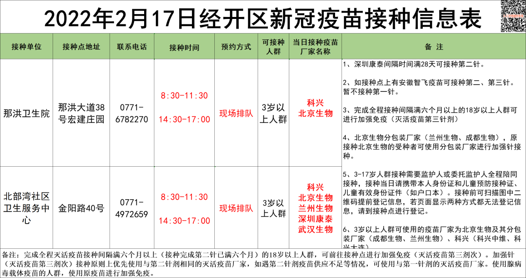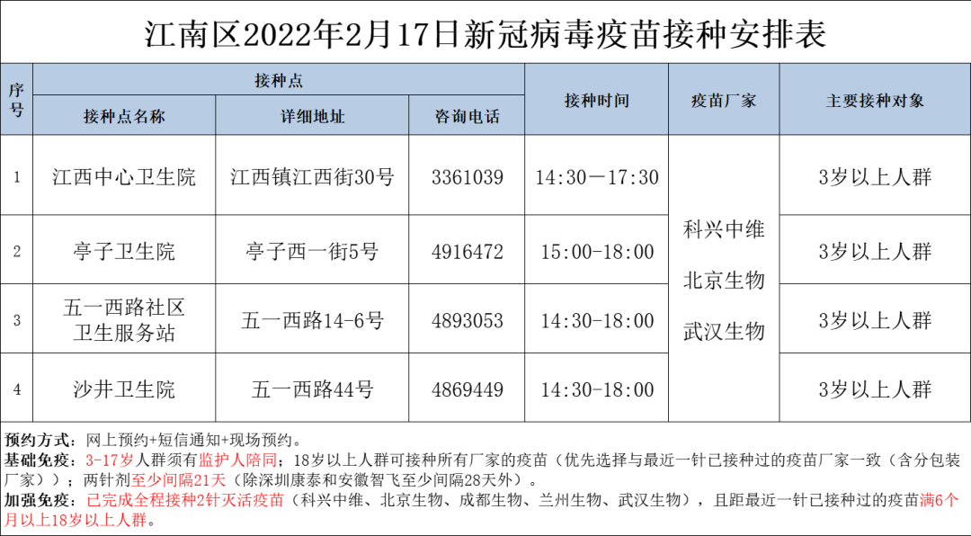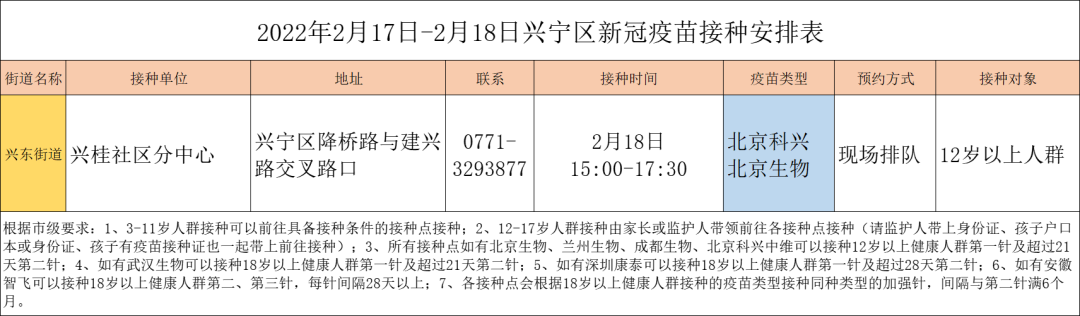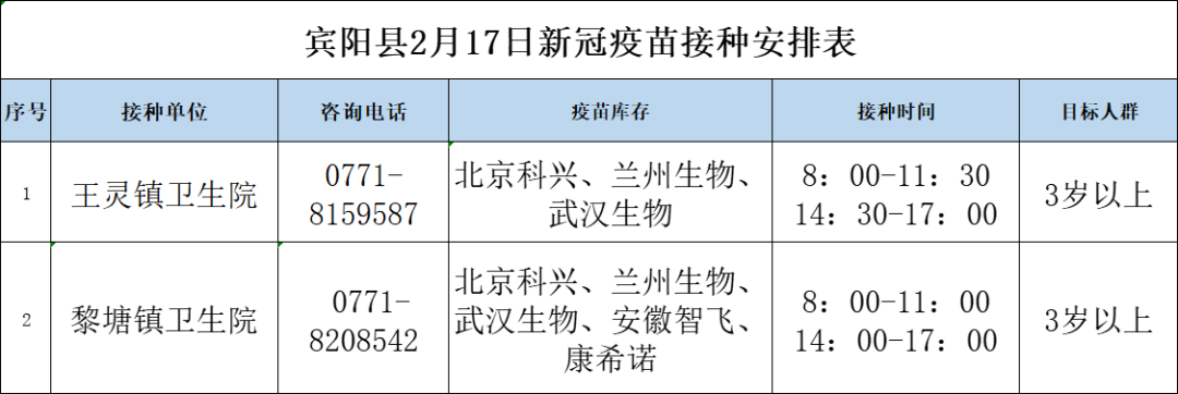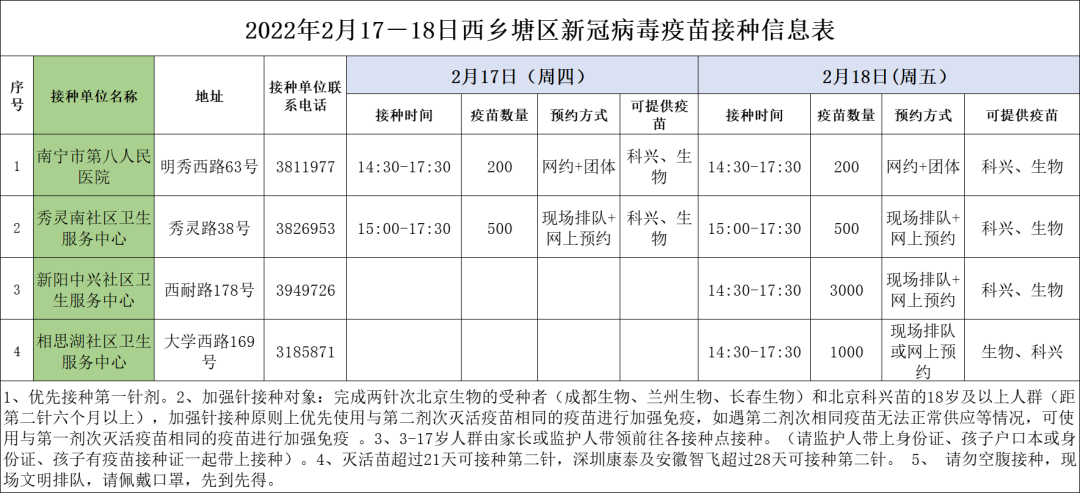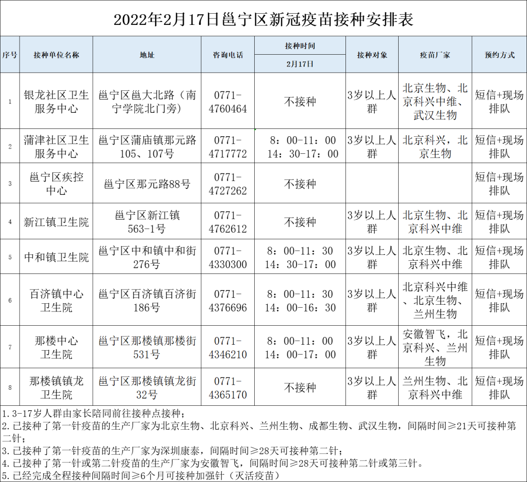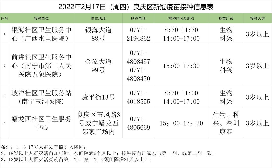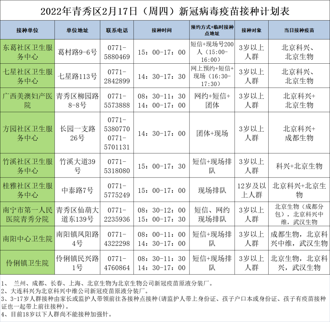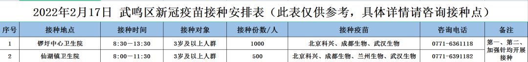 最新!2月17日南宁市各城区、县区疫苗接种安排→ 南宁疾控 02-17 09:17 2月17日南宁市新冠疫苗接种安排来啦!快转发告诉亲朋好友吧青秀区 兴宁区 西乡塘区 江南区 良庆区 邕宁区 经开区 武鸣区 马山县 上林县 宾阳县 0人点赞