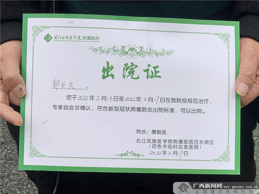 右江民族医学院附属医院百东院区(百色市临时应急医院)颁发的出院证。广西新闻网记者 李冠宏 摄