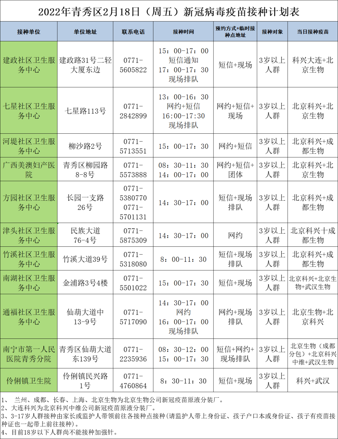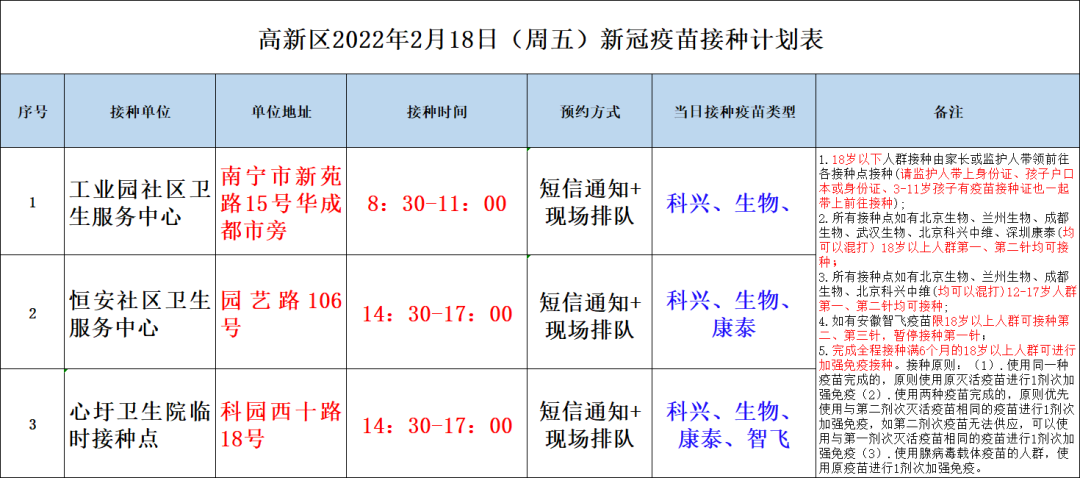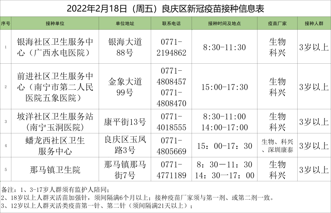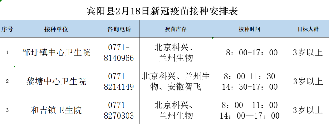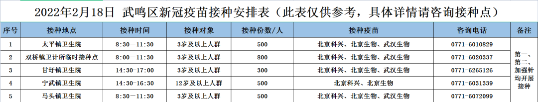 最新!2月18日南宁市各城区、县区疫苗接种安排→ 02-18 08:35 2月18日南宁市新冠疫苗接种安排来啦!快转发告诉亲朋好友吧青秀区 兴宁区 西乡塘区 江南区 良庆区 邕宁区 高新区 武鸣区 马山县 上林县 隆安县 宾阳县 0人点赞