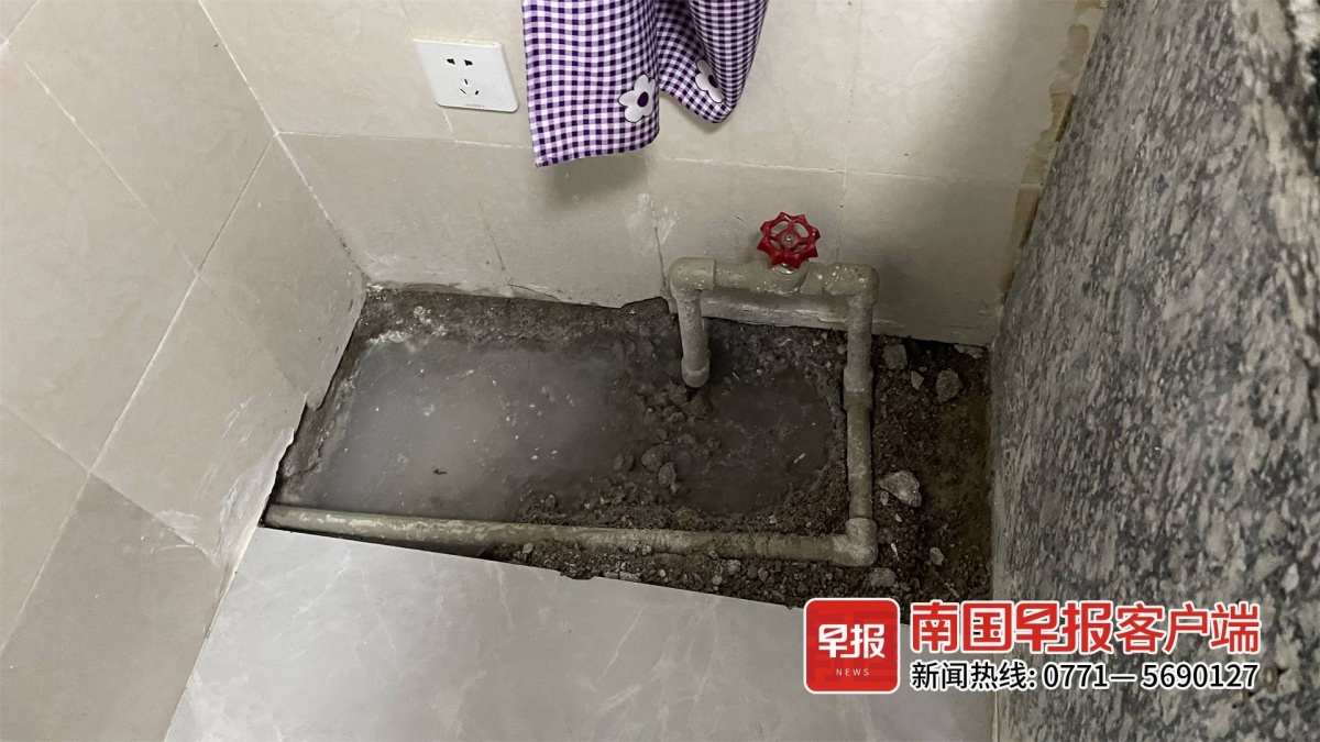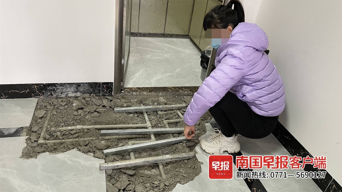 18日下午,南国早报客户端记者在奚女士家看到,客厅靠近厨房门的地板上开挖了一个长、宽各约1米的坑洞,多条水管赤裸在地面。厨房里也有一个长约80厘米、宽约10厘米的小坑洞。