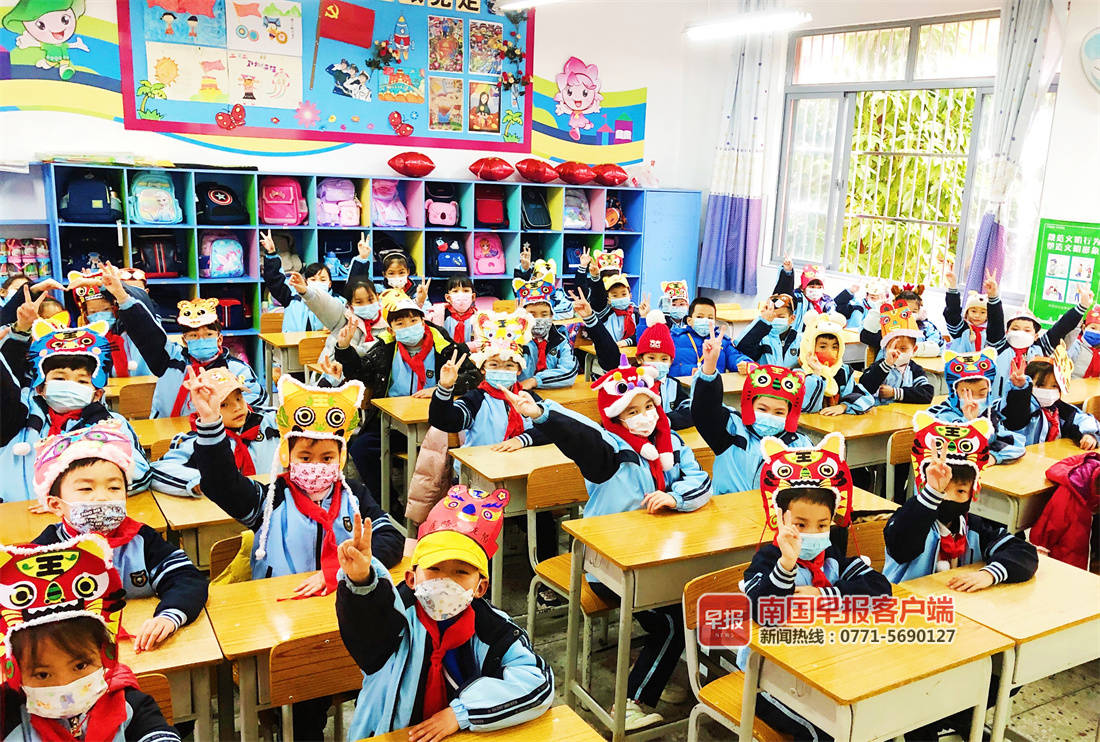 南宁市虹桥小学里,孩子们头戴假期自制的虎头帽进入校园,寓意在新学期能像小老虎一样虎虎生威。南宁市月湾路小学为孩子们精心准备了一面“虎气”红包墙,里面放有特制的安全小书签。