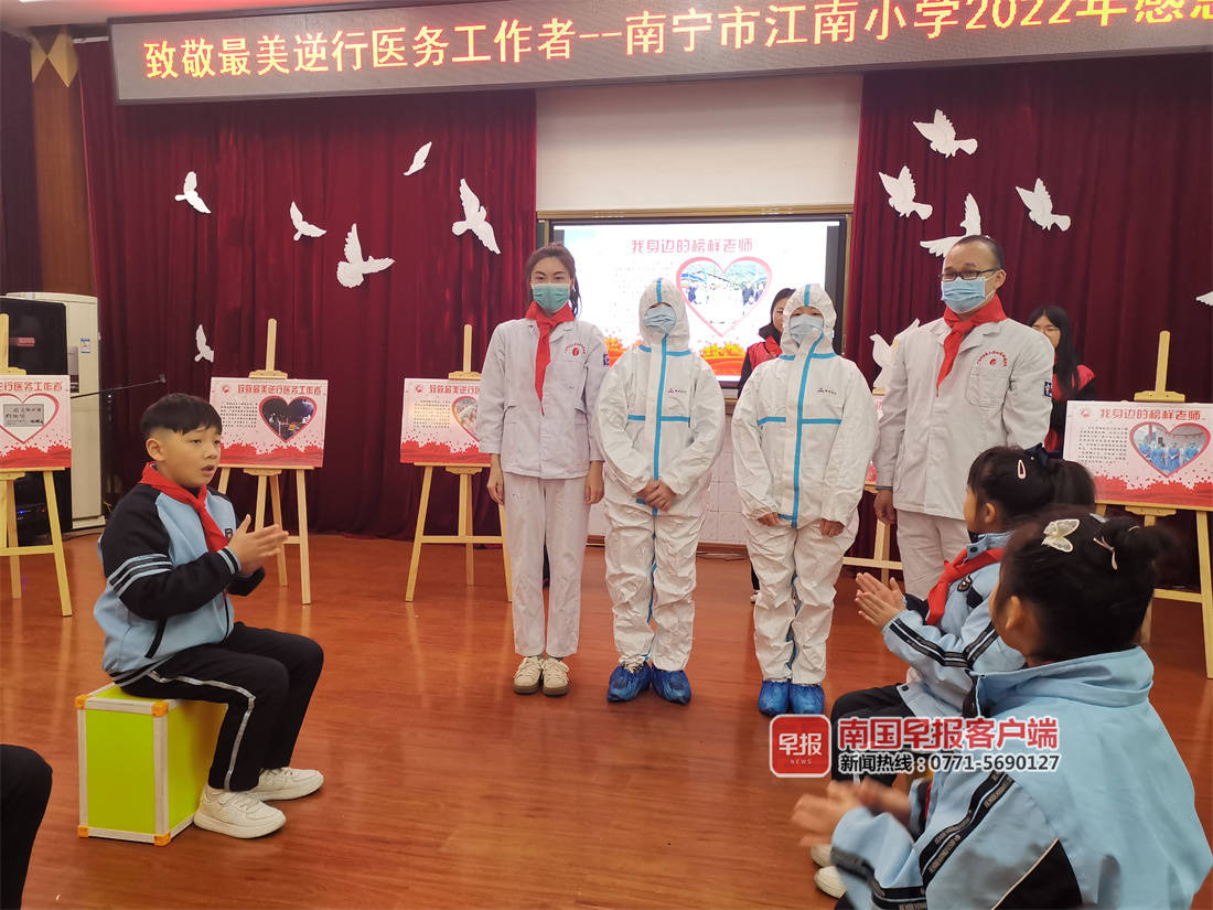 在南宁市五象新区第四实验小学的开学典礼上,该校领导与孩子们也回顾了广西百色抗疫中的感人故事,鼓舞孩子们在学习和生活中都要有团结一心的凝聚力。开学典礼上,学校还邀请参加抗疫一线的医护人员学生家长讲述百色抗疫中的点滴事迹,引导学生正确“追星”。