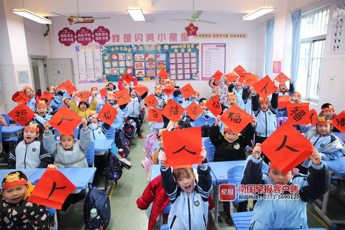 南宁市虹桥小学各班班主任给学生派发新春红包,红包里有一粒种子及一张虎年祝福券,预示着新的学期新的希望。在五六年级的教室里,该校还给今年本命年的“虎娃”们送上了虎年福袋,祝愿这些“小老虎”们在新的一年争做爱心虎”、“勤奋虎”、“希望虎”……