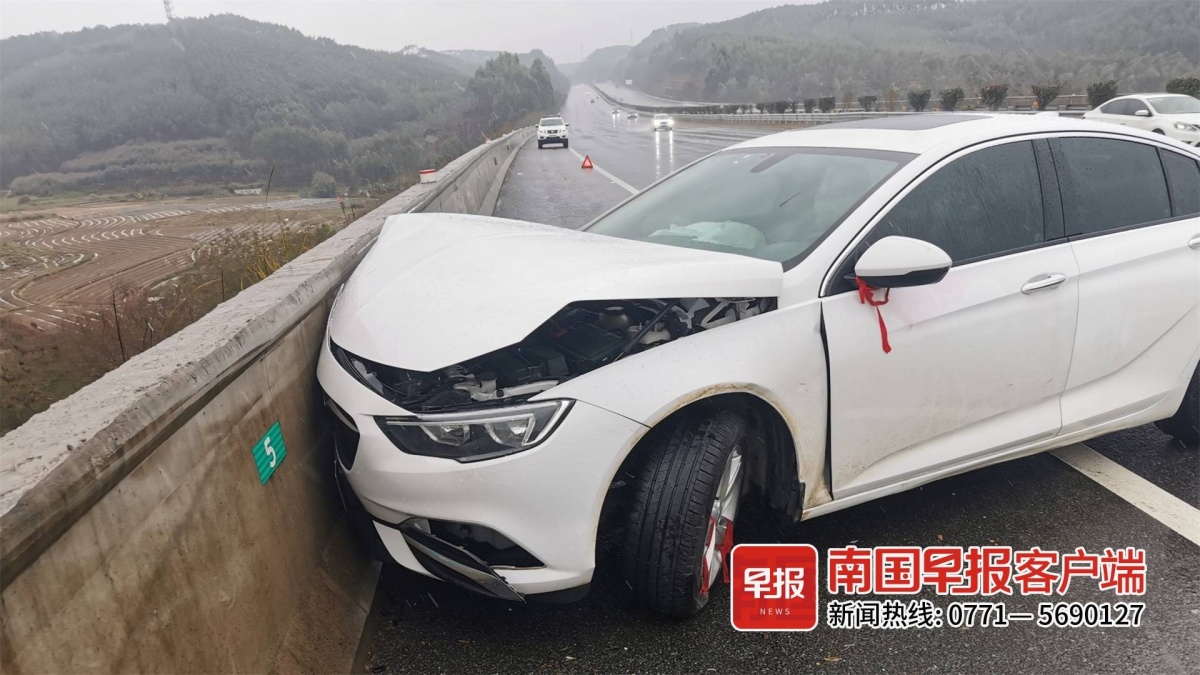 2月20日下午4时40分,广西高速交警五大队民警在泉南高速公路1417公里处,发现一辆桂R牌的白色小车车头撞到应急车道护栏上,车头受损。司机说,当时他行驶在第一车道,看到前方有积水,本想打方向盘实行变道,结果路面湿滑加上车速过快,造成车辆失控,漂移撞上应急车道的护栏,所幸驾乘人员系好了安全带,均未受伤。