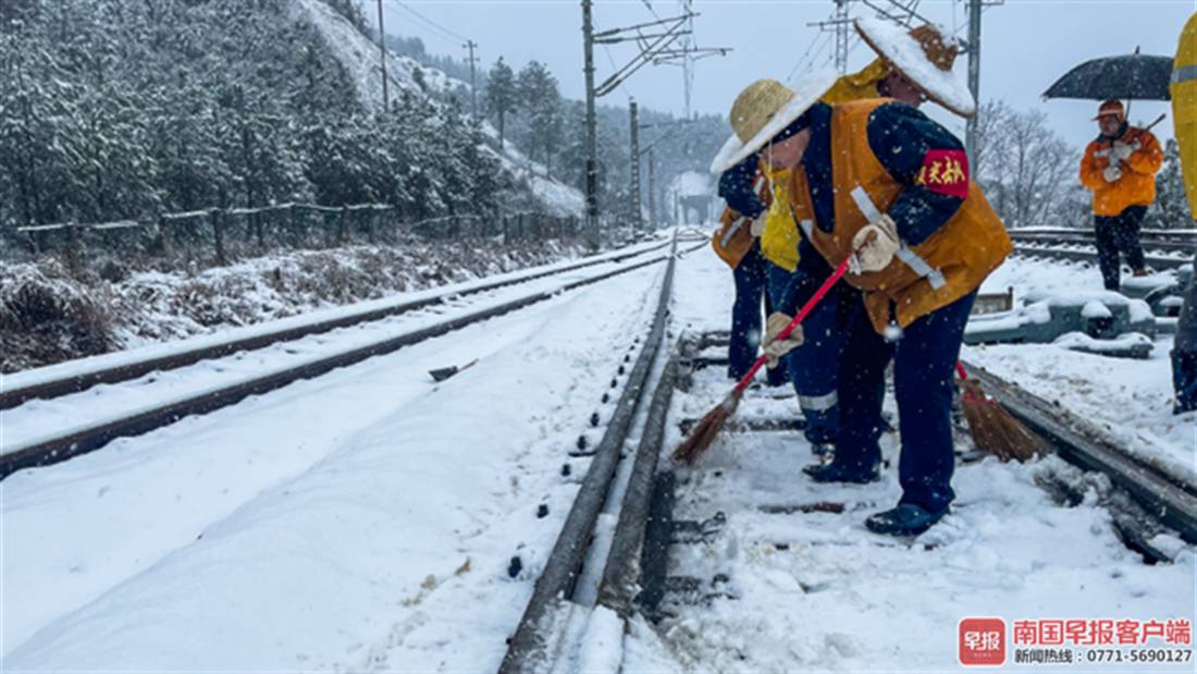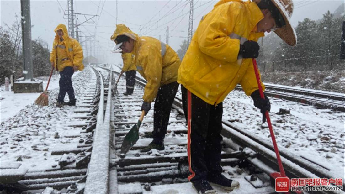 ▲柳州工务段、车务段党团员突击队对道岔进行扫雪除冰。许紫朝 摄