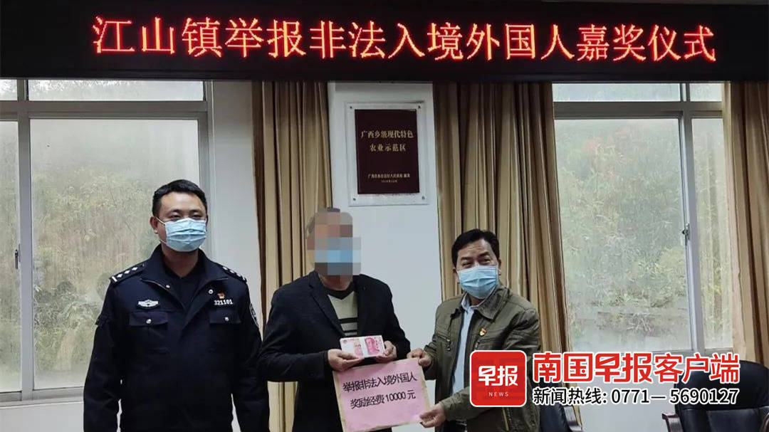 今年1月,防城区疫情防控指挥部曾发布通告,对举报和协助抓获违法嫌疑人的行为给予奖励。2月18日,江山边境派出所联合政府举行嘉奖仪式,奖励积极举报并协助抓获非法入境外籍人员的李先生奖金1万元。
