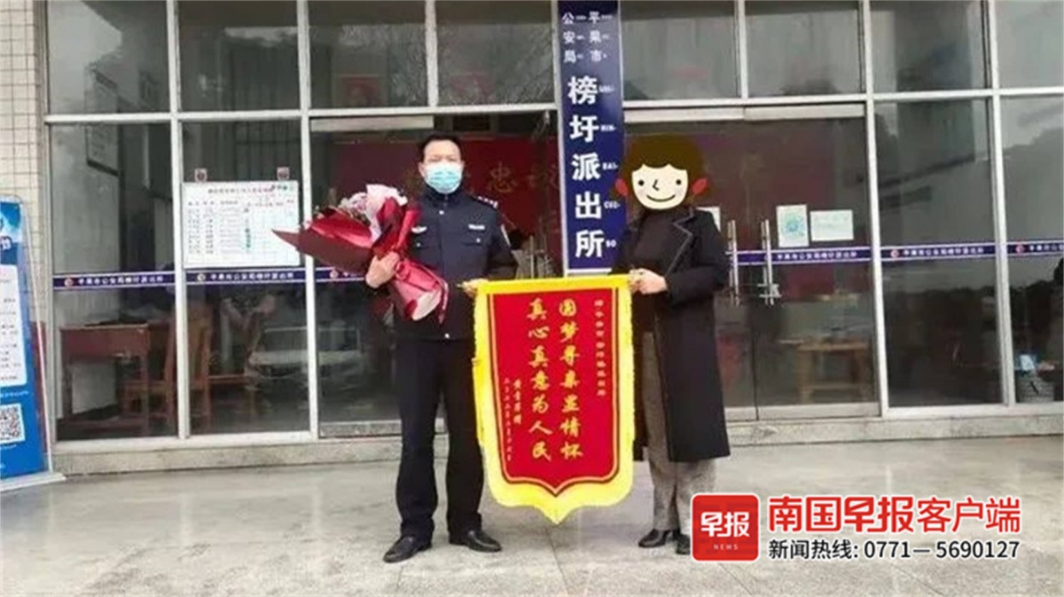 2月17日,黄小冰给平果市公安局榜圩派出所民警送上锦旗,表示感谢。