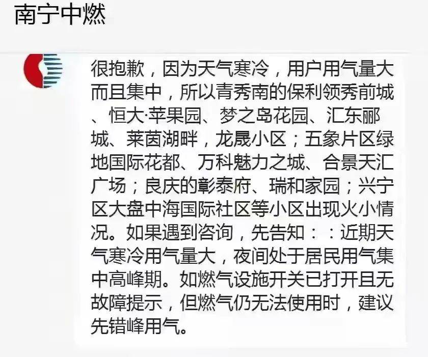 南宁中燃通过微信公众号向部分小区物业公司工作人员发出提示,称因为天气太冷,用户用气量大而且集中,所以青秀南的保利领秀前城、恒大·苹果园、梦之岛花园、汇东郦城、莱茵湖畔、龙晟小区;五象片区绿地国际花都、万科魅力之城、合景天汇广场;良庆的彰泰府、瑞和家园;兴宁区大盘中海国际社区等小区出现火小情况。