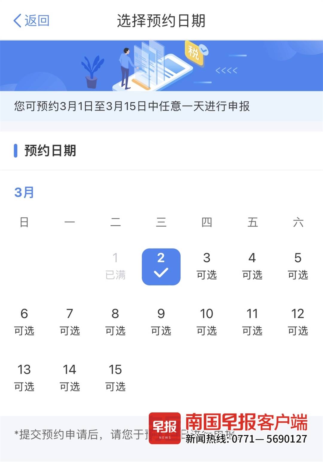 南国早报客户端记者从税务部门了解到,为进一步提升办税效率和申报体验,今年税务部门推出预约办税服务,如需在年度汇算高峰期的3月1日至15日之间办理,纳税人可在3月15日前,每天早上6时至晚上10时登录手机个人所得税App进行预约。
