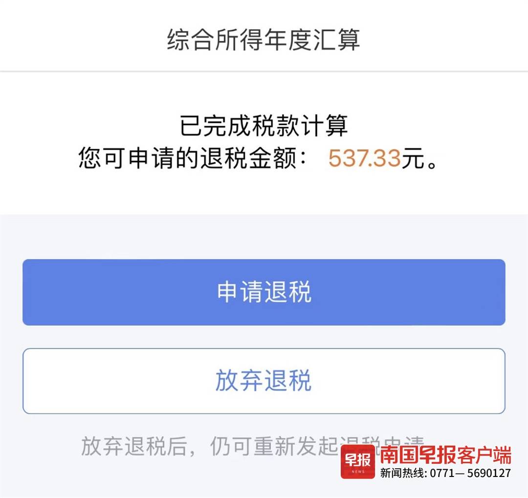 3月1日上午,已提前预约的市民易先生登录个人所得税App,按照个税年度汇算流程进行申报操作,在完成相应的税款计算后,成功发起金额为500多元的退税申请。