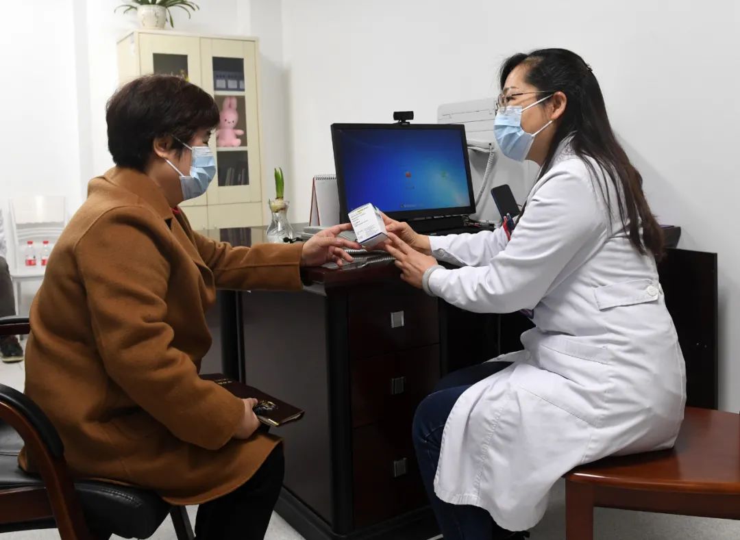 在广西壮族自治区妇幼保健院,杜丽群(左)向阮毅燕医生了解罕见疾病用药及其价格情况。新华社记者 陆波岸 摄